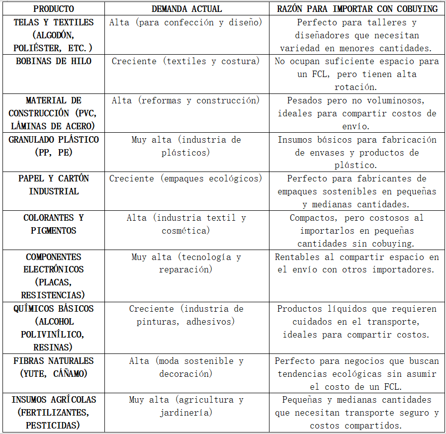 Aquí tienes ejemplos con productos de materia prima que pueden ser ideales para el cobuying, considerando la demanda actual y su rentabilidad para importadores: